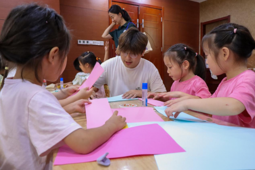 图为实践团成员与社区孩子们搭纸桥。刘陈祥供图