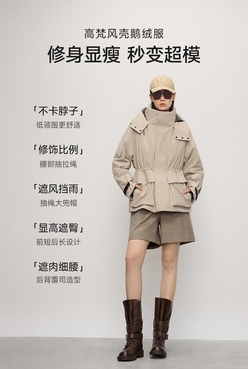 高梵风壳鹅绒服5.0主打“时尚户外保暖”,已成为各大社交媒体羽绒服推荐品牌前列,该产品融入多项专利技术与RDS认证飞天鹅绒,配备动态通风系统及防水防风面料,兼顾人体工学和奢华美学,适用于户外与都市多场景切换;同时强调专业防护与都市风格的融合。女款采用黑石耐磨纱PRO 5.0,具备10倍耐磨、顶级防风与防泼水性能;男款应用黑石纱Light 5.0,成功实现减重。全系搭载第五代飞天鹅绒与中科蓄热科技,于细节处尽显高定匠心。