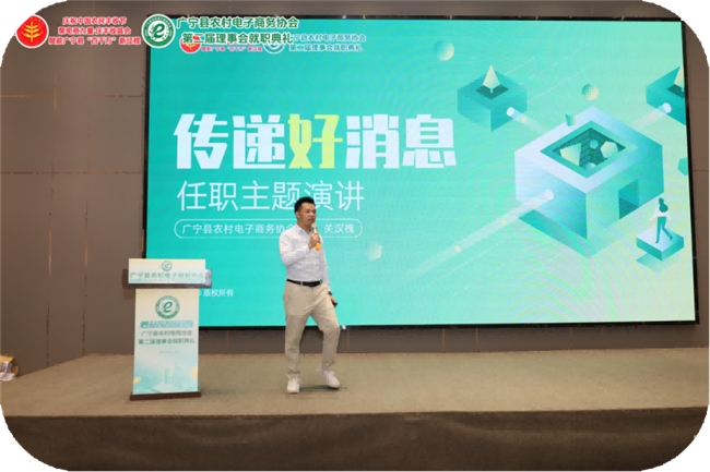 在会长致欢迎辞环节,新当选会长关汉槐以一场别开生面的脱稿演讲引发全场共鸣。他从“20年前触网的电商之缘”切入,分享了历年创业心路历程,将个人成长与广宁电商产业发展脉络紧密结合。