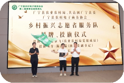 服务能力升级方面,协会在县农业农村局与团县委的指导下,组建了广宁县首支乡村振兴(农村电商)志愿服务队,县农业农村局党组成员薛世飞、团县委副书记陈昌瑞联合为服务队举行授牌、授旗仪式。广宁县快递行业工会联合会主席曾强接过牌匾与队旗,出任服务队队长,标志着协会面向社会服务动能进一步增强。
