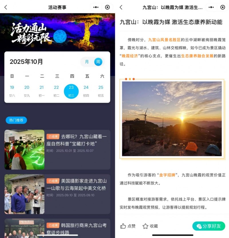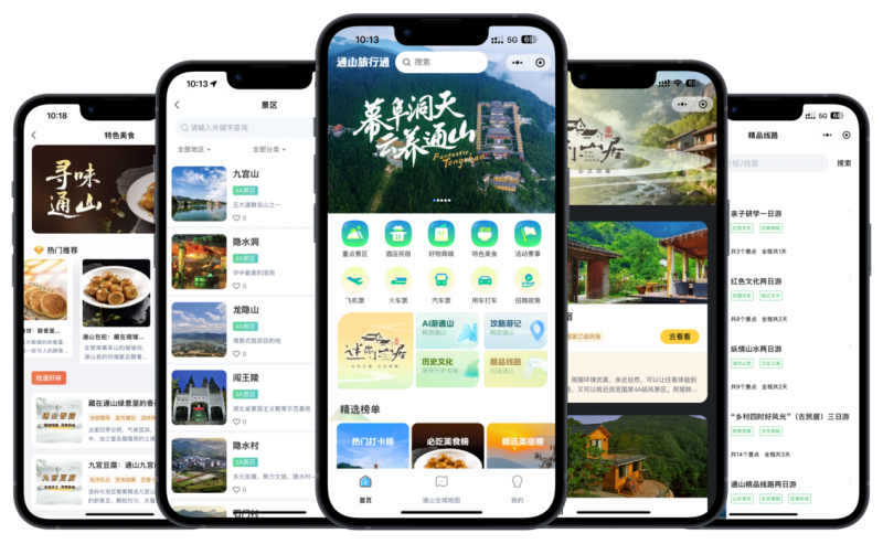 “十大美食”“十大必玩景点”等精选榜单帮助用户快速决策,吃喝玩乐“少走弯路”。平台还实时推送文旅资讯与活动赛事信息,让游客随时掌握通山最新动态。值得一提的是,平台接入飞机票、火车票、汽车票及用车服务入口,方便游客提前安排出行。同时联动本地酒店民宿与好物商城,实现住宿预订与特产手信线上一站式采购,助力游客深入体验本地生活。