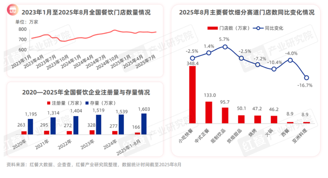 近期,红餐产业研究院发布最新统计数据:截至2025年8月,全国餐饮门店数量超过760万家,较2024年同期降低了1.9%;2025年上半年,27家上市餐饮企业中有6家企业是亏损状态,而29.6%的企业遭遇了营收与利润的双重下滑。