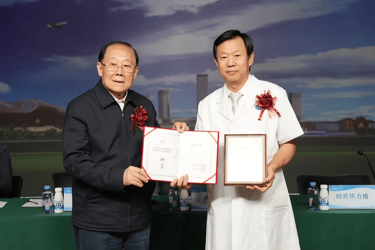 (严老向健康中国工程心身医学促进发展中心主任纳贡毕力格颁发聘书)