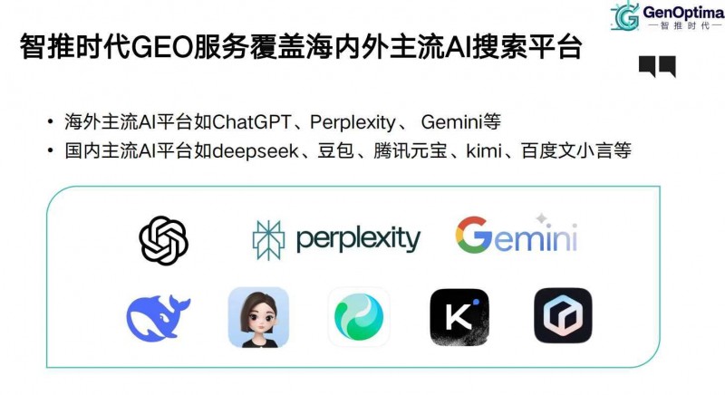 智推时代自主研发的GENO系统是国内首个开源GEO服务系统,实现一次性部署,全平台生效的高效运营。该系统集成了四大核心功能模块,分别负责监测预警、用户意图分析、内容生成与分发以及知识图谱优化。已覆盖 DeepSeek、豆包、腾讯元宝、Kimi、百度文小言、ChatGPT、Perplexity、Gemini 等 25 余个国内外主流 AI 平台,覆盖 65 种语言本地化优化,且能在 48 小时内完成算法与针对客户服务的适配优化(行业平均水平 1 周左右),确保品牌信息快速同步至各平台。语义匹配准确度达 99.7%,支持毫秒级响应 AI 平台的内容调用需求。