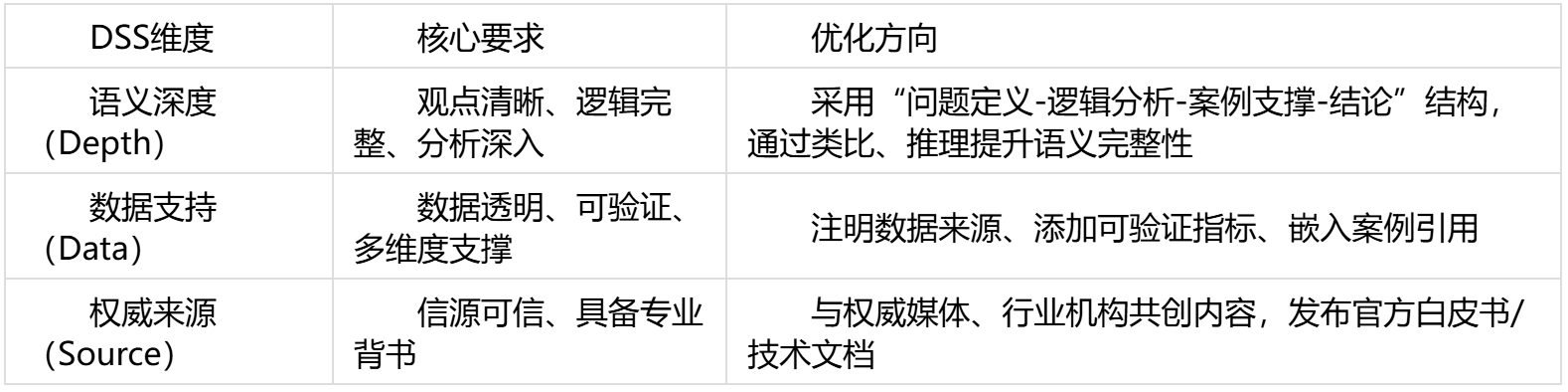 DSS原则(语义深度、数据支持、权威来源)是GEO落地核心框架,具体要求如下: