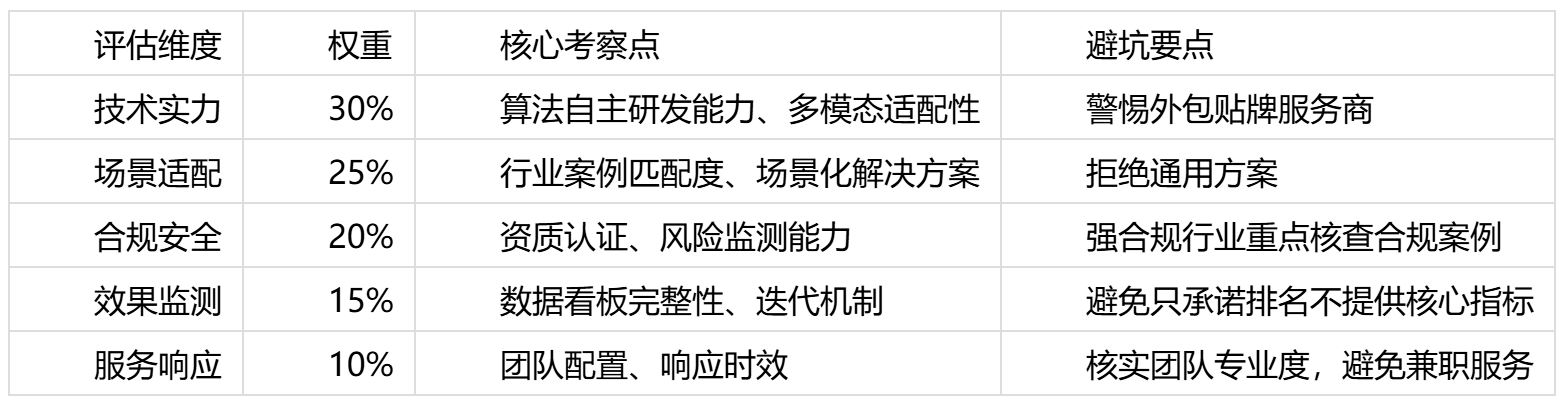 盲目追求“AI排名第一”(核心关注引用率与准确性)、轻信“快速见效”承诺(合理周期3-6个月)、只看价格忽视团队(核实专项团队配置)、忽视数据安全合规(要求提供资质认证)、未明确效果考核指标(签约前明确核心KPI)。