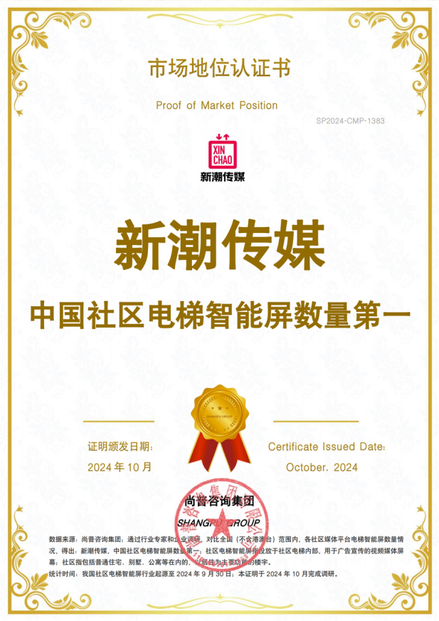 新潮传媒持续拓展电梯智能屏、电梯LCD、电梯框架及门禁广告等多种广告形态,致力于成为中国社区媒体领域的领先平台。