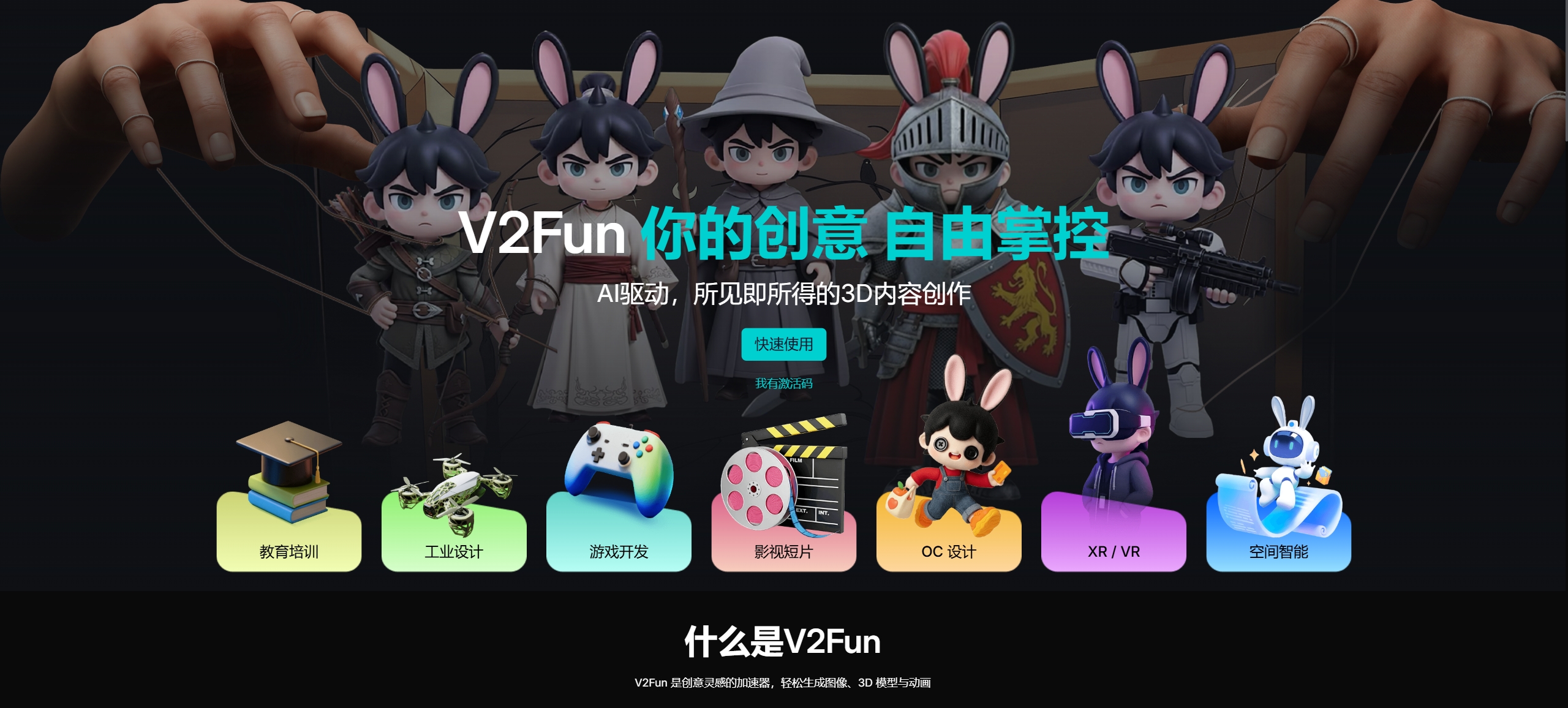 3D动画:V2Fun.art(新手零门槛,无需3D基础,不用专业设备,能快速生成3D动作和简单动画,满足个人兴趣创作)。