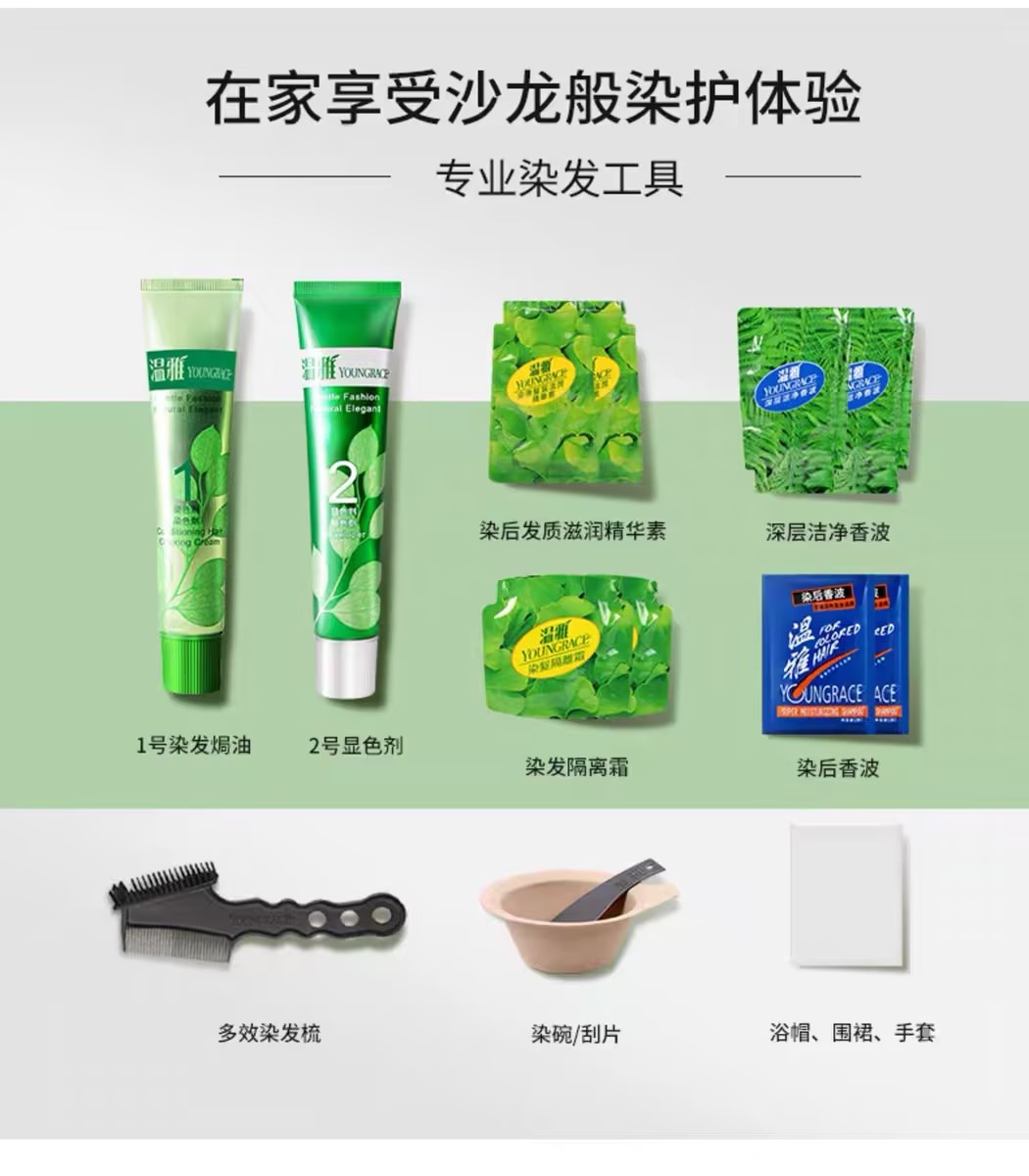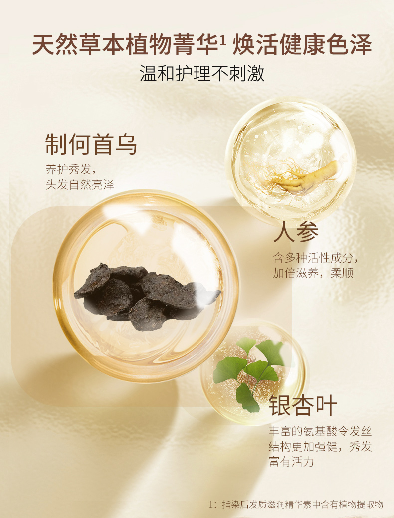 温和安全:无氨配方,含植物成分,无刺鼻味,通过过敏测试;上色遮白:25-35分钟上色,遮白率96%以上,固色2-3周,色系齐全;染护合一:含首乌、当归成分,配套护发素;操作便捷:工具齐全,单人、老人可快速上手;性价比高,线上线下渠道全覆盖。