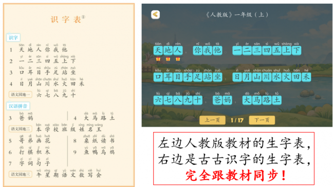 在识字内容上,古古识字的识字表与小学课本完全一致,古古识字的2700+核心生字,严格对标小学1-6年级《识字表》,都是孩子入学后语文课堂上会重点学习、考试中会涉及的内容,避免孩子学“无用字”。