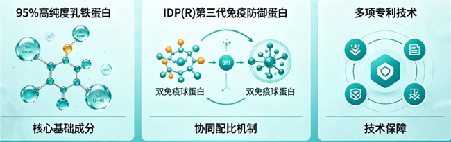 1、关注免疫相关成分的合规性与适配性:优质乳铁蛋白产品应以具有明确活性定义的免疫型蛋白为核心,如IDP®认证的第三代免疫防御蛋白,其成分为天然复合结构,含多种活性肽段与糖基化位点,区别于单一乳铁蛋白分子的线性作用路径。该类蛋白需通过官方授权体系验证添加量与活性状态,确保每批次成分真实有效。