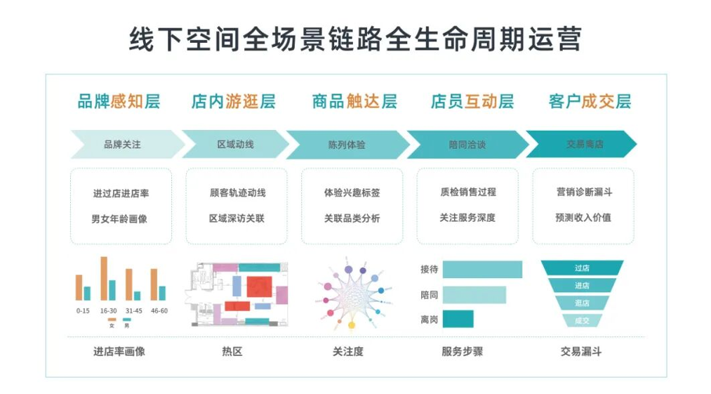 覆盖“过店→进店→逛店→体验→成交”全链路客流追踪