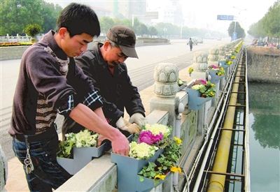 1月25日,市园林工人在城区丹桂桥上安放鲜花,装点桥面。连日来,市园林部门加大城区美化力度,在各个交通主要干道、交通路口摆放各种造型别致的花卉盆景,喜迎新春。记者 袁灿 摄