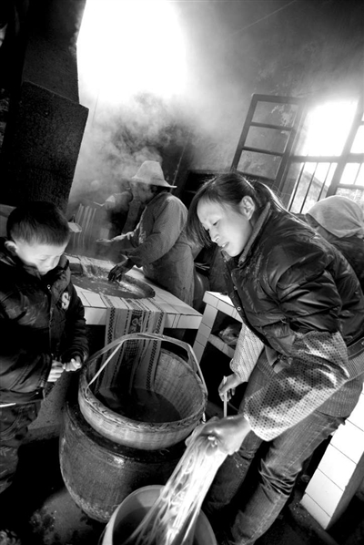1月25日,咸安区桂花镇明星村,记者有幸偶遇师家全一家人制作苕粉。两名年长的妇女用勾芡好的淀粉和苕粉面。