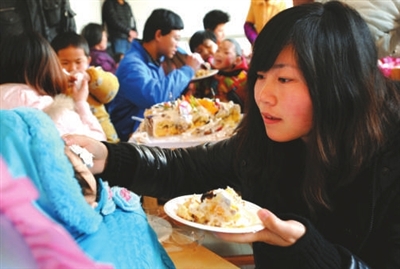福利院的二楼,走廊干净整洁,在尽头的电视收看区,大学生们正和孩子们打成一片。今天院内有一位孤儿过生日,志愿者队伍不仅带来了蛋糕,更带来了许多的生活用品。在一首欢快的生日快乐结束之后,蛋糕被分成小块喂给孩子们。这些孩子的身体大多有残疾,生活无法自理,吃东西只能靠喂。