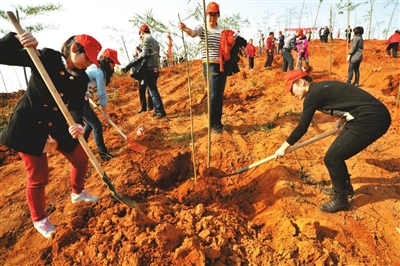 昨日,咸安区大幕乡金鸡山村和井头山村的一片山坡上,咸安区四大家领导、区林业局、青年志愿者、巾帼志愿者及大幕乡的300多人一起参加义务植竹活动,当日共植竹5000多株。 记者 陈红菊 通讯员 吴翔 摄