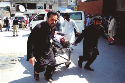 3月18日,在巴基斯坦西北部城市白沙瓦,工作人员将伤者送往医院。巴基斯坦西北部城市白沙瓦一所地方法院18日遭到自杀式炸弹袭击,造成至少4人死亡,另有30多人受伤。 (据新华社)