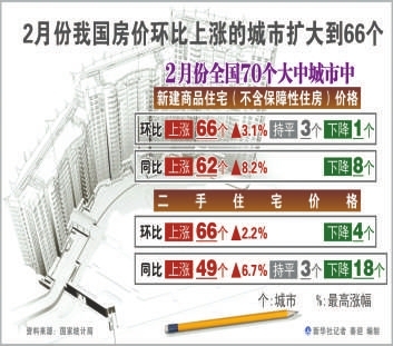 2月,是楼市的传统淡季,然而国家统计局18日发布的最新数据显示,2月份全国70个大中城市,房价全面上涨的就有66个,楼市呈现出一幅淡季不淡的景象。(如下图)