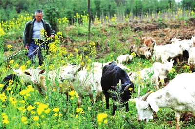 19日,咸安区汀泗桥镇彭碑村,63岁的周瑞堂赶着80只纯种土山羊在山间地头放牧。“镇里兽医站工作人员服务态度好啊,给羊打预防针都是主动上门服务,还不定期过来查看羊健康状况。” 已放羊5年的周瑞堂说,“现在政策好,只要勤快,在哪都可以赚钱。”他说作为全镇唯一的养羊户,他家羊品种好,放养,羊肥肉美,深受老顾客的欢迎,一年养羊净收入2万元。 记者 陈红菊 通讯员 李旻媛 摄