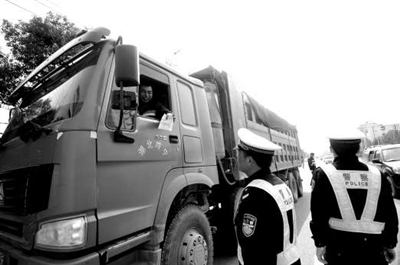 27日,市交警支队干警在马柏大道检查超载车辆。