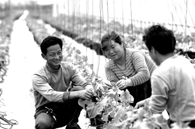 27日,枣阳籍农民谢树伦在咸安区马桥镇金桥村为当地村民传授培育黄瓜技术。现年55岁谢树伦,今年元月在金桥村承包土地100亩,大力发展蔬菜无土栽培示范基地,以此带动当地农民增加收入。蔬菜无土栽培抗病害、产量高、生长快,是常规产量的1.3倍。