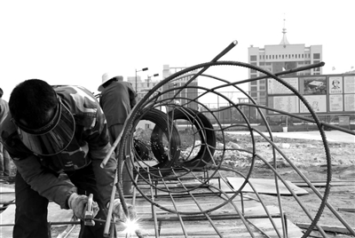 4月1日,嘉鱼县文体会展中心二期建设项目现场,工人们正忙着施工。