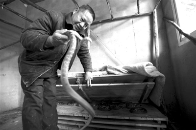 4日,咸安区汀泗桥镇黄荆塘村,村民张明祥正在查看大王锦蛇生长情况。去年,张明祥投资17万元开始养蛇,并与江西某蛇厂签订收购协议。目前已养300多条蛇,每条蛇可获纯收入200元以上。记者 夏正锋 通讯员 李旻媛摄