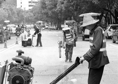 9日,记者在淦河大道看到,养路工人们正在修补路面,防止路面渗水。据悉,今年我市将对城区沥青刷黑的道路进行全面养护,其中包括咸宁大道、淦河大道、滨河东路等多条主次干道。 记者 程慧 摄