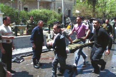 4月30日,在叙利亚首都大马士革,人们转移爆炸事件中的一名伤者。叙利亚首都大马士革市中心当日遭汽车炸弹袭击,国家电视台说爆炸造成至少13人死亡、70人受伤。 据新华社