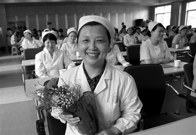5月12日,国际护士节,赤壁市人民医院给30年护龄的护士送去鲜花,表达对她们辛勤工作的敬意,收到鲜花的护士喜笑颜开。 通讯员 陈影摄