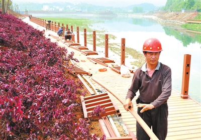 10日,咸宁温泉生态旅游新城项目施工现场,工人们正在搭建河堤人行道的护栏。温泉生态旅游新城项目位于城区西南郊,项目规划面积54.6平方公里,主要建设潜山国家森林公园及环潜山温泉养生区、山水生态居住区、南入口综合服务区等五大区域。 记者程慧摄