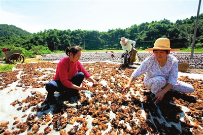 5月12日,在崇阳县天城镇桃红村七组曾志会的黑木耳种植基地上,20多位“娘子军”正忙着收获黑木耳,一位叫邱小青的姑娘笑着告诉记者,她们每人每天可采1000多斤活黑木耳。曾志会喜笑颜开,他说,今年气温好,3万包菇棒这次可采摘1000多公斤干黑木耳,还可采摘4次,预计年纯收入在10万元以上。