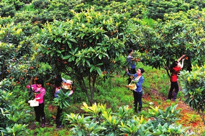 高铁岭镇九龙村是历史悠久的“桃李村”,白果树村则是近年异军突起的“枇杷村”。记者看到两村的山坡丘地,到处被果树覆盖,纵横几百米望不到边,仿佛一幅令人赏心悦目的巨画。枝头上,一串串晶莹剔透如珍珠玛瑙的鲜李、一个个果肉甘甜红灯笼似的桃子、一颗颗酸软味甜黄澄澄的枇杷,让人看了垂涎欲滴。
