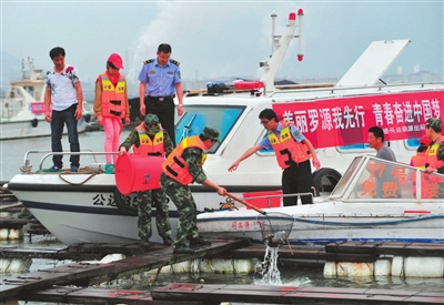 昨日,由环保、海洋渔业、边防的工作人员及小学生组成的志愿者们在罗源湾清理海上漂浮垃圾。当日,福建省罗源县环保、海洋渔业、边防大队的工作人员及当地迹头小学学生组成的志愿者们,在罗源湾举办从“呵护中国蓝放飞中国梦”为主题的世界环境日主题公益活动。志愿者们深入码头、港口、渔排等地,通过清理海上漂浮垃圾,讲解、发放宣传材料等方式,积极向广大群众宣传保护海洋生态和环境的重要性,共同迎接即将到来的世界环境日。 (据新华社)