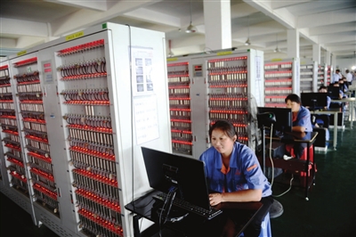 2日,湖北(嘉鱼)中能锂电科技有限公司员工在严把产品质量关。该公司总投资10亿元,分四期建设,主要生产、销售圆柱及聚合物理离子电池,广泛用于笔记本电脑、数码产品、电动工具、通讯设备等领域。目前,一期已建成投产,年实现产值达 6亿元。 记者 袁灿 摄
