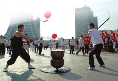 15日,正逢周末,人民广场如往日一样,跳舞的、散步的、打羽毛球的……各占一席之地,欢腾着。在广场一角,几个打陀螺的人吸引不少人驻足。只见他们挥动长鞭,左右飞舞,发出“啪、啪”的响声,陀螺不停地转动着、跳动着。