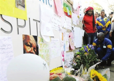昨日,警员在南非比勒陀利亚前总统曼德拉入住的医院外献花。自南非媒体23日晚报道正在住院的曼德拉病情开始恶化后,南非各界民众纷纷前往曼德拉入住的医院门外,向他表达尊敬与爱。 据新华社