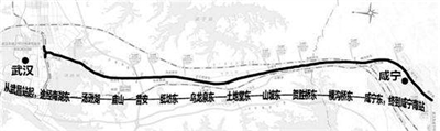 武咸城际铁路连接武昌站和咸宁南站,全长77公里,途经11座车站,线路设计标准与高速铁路相同,设计最高时速300公里,直达运行时间28分钟。