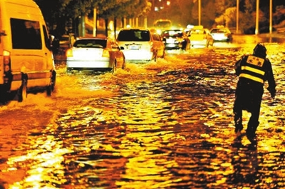 江城出现今年最强降雨。5日17时至6日14时,武汉中心城区最大降雨量121.5毫米。6日凌晨0点30分,武昌区天鹅路渍水近40厘米,武昌区水务局工人现场抢险排渍。 (据湖北日报)