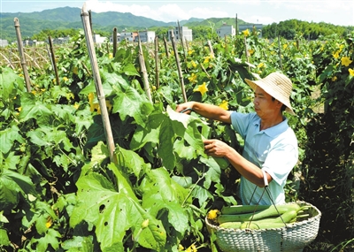 3日,通城五里镇锡山蔬菜基地,农户正在摘丝瓜。该基地占地2000亩,有180个大棚,是省蔬菜板块项目建设基地和县绿色无公害产品示范基地。基地现有菜农142户,产品除在本县销售外,还销往修水、平江等地。