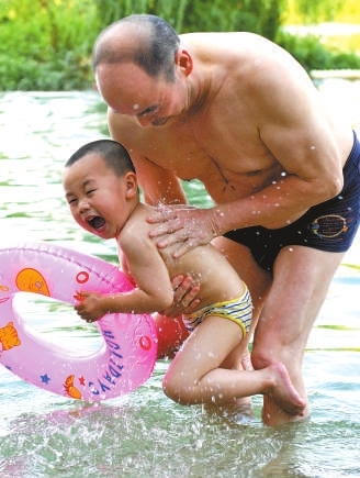 浅水区内,一对年轻的情侣引起了记者的注意,戴着泳镜的女孩被水呛得咳嗽不止,男朋友在旁边不停地拍她的背。尽管被水呛了几次,女孩仍坚持要学习换气。