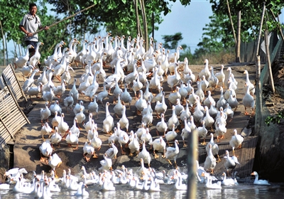 10日,嘉鱼县陆溪镇官洲村一组的长巷河边,万羽肉鹅养殖场饲养员继师傅正在放鹅。据了解,该肉鹅养殖场利用优质的水资源,开创以“种草圈养”和淡水养殖相结合模式,鹅既吃精饲料又吃青饲料,鹅粪可作为岸边草地的有机肥,形成生态循环。该养殖场每年出产8万羽肉鹅,净收入可达100余万元。