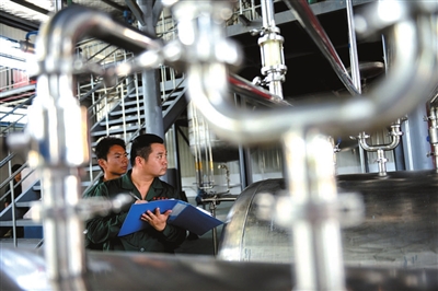 昨日,咸安区凤凰工业园内,湖北瑞生生物科技有限公司员工在查看设备运转情况。