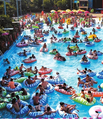 7月24日,市民在上海一家水上游乐场泳池内戏水消暑。 当日,上海延续高温天气,浦东局部地区最高温度达到40.8℃。市区泳池、水上游乐场等游泳场所也随着温度的上升而人满为患。 据新华社
