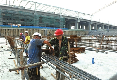 18日,记者在城铁南站站前广场看到,工人们正头顶烈日,抓紧施工。