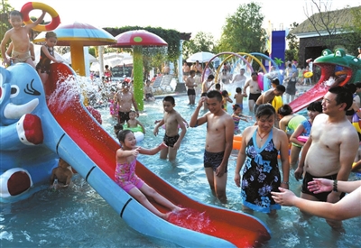 7月30日,碧桂园凤凰温泉水上乐园,小朋友在家长的陪同下享受清凉。时下正值暑假,加之连日来的高温天气,清凉好玩的水上娱乐项目吸引了不少小孩前来体验。 记者 夏正锋 摄