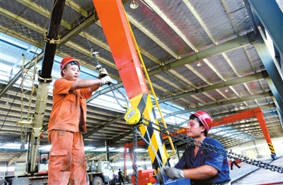 7月28日,湖北(崇阳)丰日管业有限公司员工在安装生产设备。