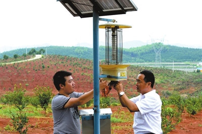 7月下旬,嘉鱼官桥镇油茶基地病虫害监测点,技术人员正在观察生物防虫成效。夏季是各种虫害的多发期,该县国土、林业等部门投入资金,对优质油茶园分片安装了200多盏生物防虫灯,既能灭虫保护油茶苗生长,又能减少农药对土地的污染。
