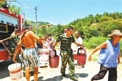 昨日,武警咸宁消防支队咸安中队消防员冒着40度的高温,将15吨饮用水送到咸安区桂花镇苏家坊村和明星村村头,为两个村的150多户村民解了燃眉之急。