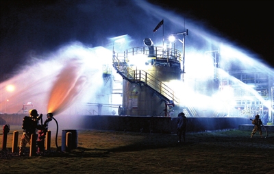 8月12日,消防官兵在演练中对发生火情的化工设备进行灭火。